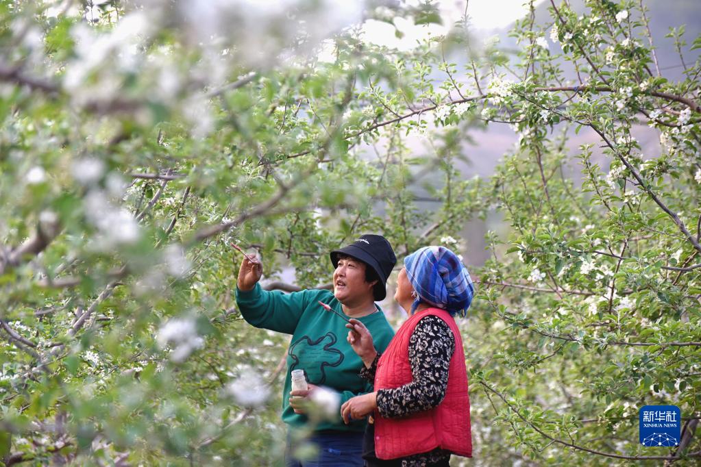 4月17日,山東省淄博市沂源縣南麻街道下高村的果農在技術(shù)員(左)帶領(lǐng)下給蘋(píng)果花授粉。