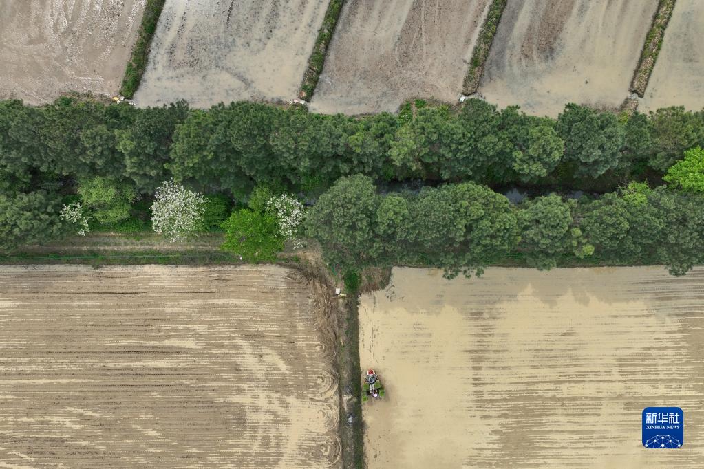 4月18日,在江蘇鎮江句容市天王鎮戴莊村,村民駕駛插秧機進(jìn)行早稻插秧工作(無(wú)人機照片)。