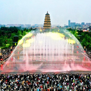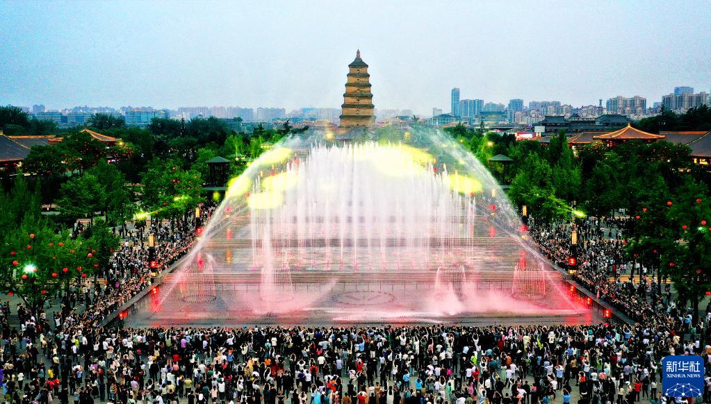 陜西西安大雁塔北廣場(chǎng)音樂(lè )噴泉是西安旅游打卡地之一,每天會(huì )進(jìn)行四場(chǎng)演出,吸引市民和游客前來(lái)觀(guān)看。