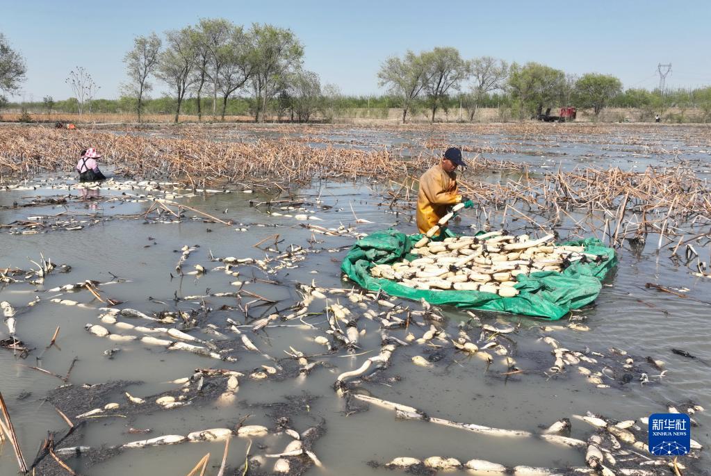 4月19日,唐山市豐南區東田莊鄉大吳莊村農民在水塘里采收蓮藕(無(wú)人機照片)。