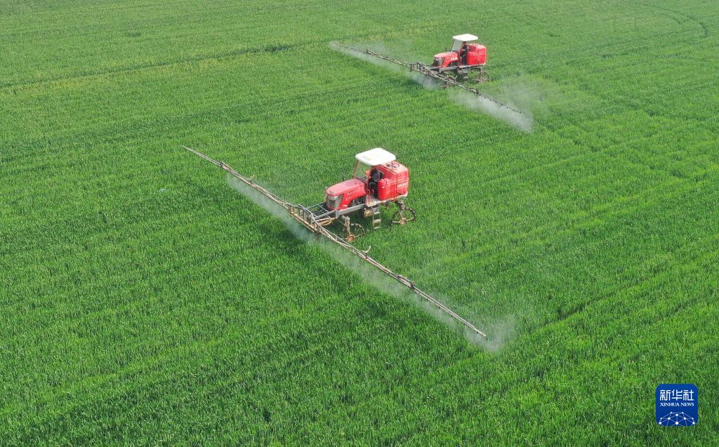 4月19日,河北省邢臺市南和區河郭鎮張相村農民使用農業(yè)機械在麥田噴灑農藥(無(wú)人機照片)。