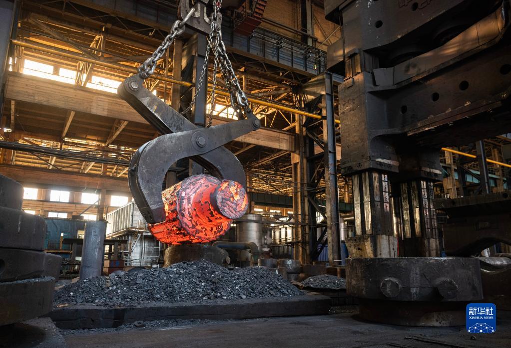 4月18日,在位于黑龍江省齊齊哈爾市的中國一重生產(chǎn)車(chē)間,吊鉗正吊運鍛件。