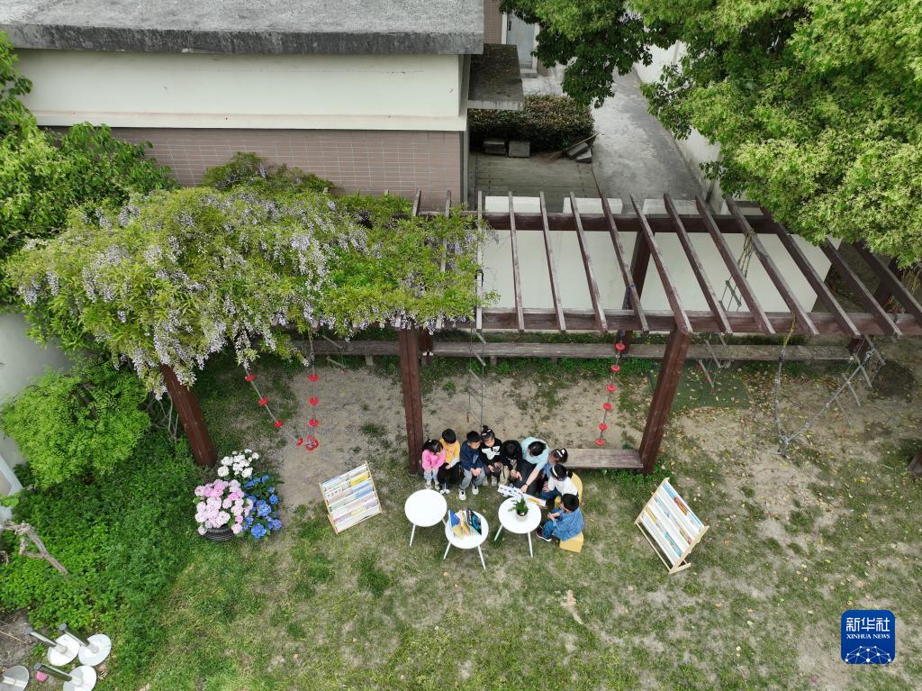 4月19日,吳興區八里店鎮中心幼兒園的老師帶著(zhù)孩子們在紫藤架下閱讀(無(wú)人機照片)。