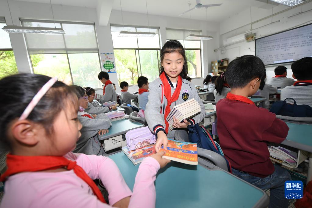 4月19日,吳興區第一小學(xué)的學(xué)生分發(fā)課外書(shū)。該校實(shí)行班級圖書(shū)借閱制度,每周為學(xué)生換一批課外書(shū)。