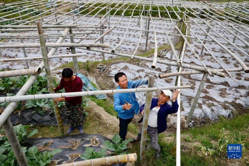 4月18日,在大湖鄉東姚村湖東果蔬農民專(zhuān)業(yè)合作社種植基地,村民在搭建種植棚。