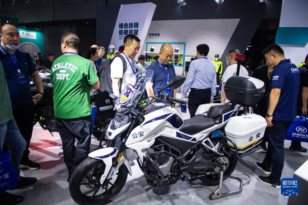4月19日,在長(cháng)沙國際會(huì )展中心,觀(guān)眾在觀(guān)看一輛警用摩托車(chē)。
