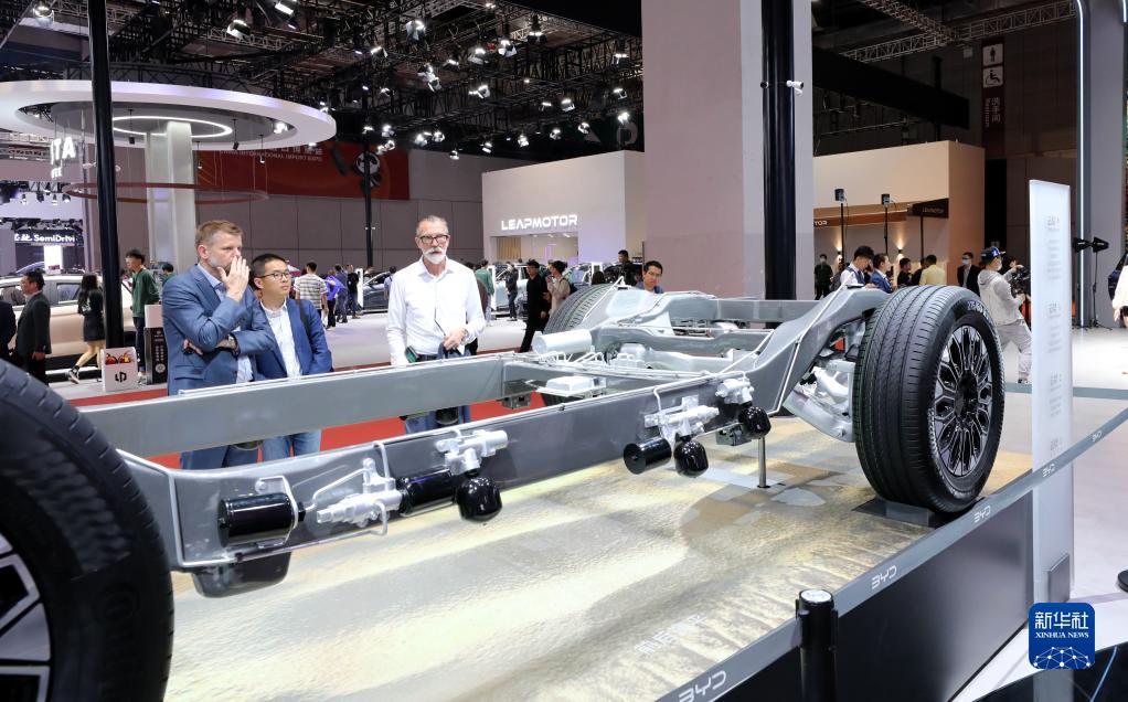 4月19日,參觀(guān)者在比亞迪汽車(chē)展臺展出的智能液壓車(chē)身控制系統展品前駐足觀(guān)看。