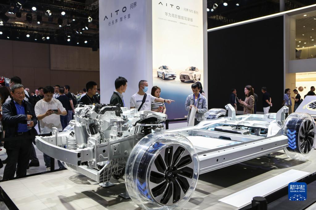 4月18日,參觀(guān)者在觀(guān)看問(wèn)界M5系列智能增程四驅平臺。