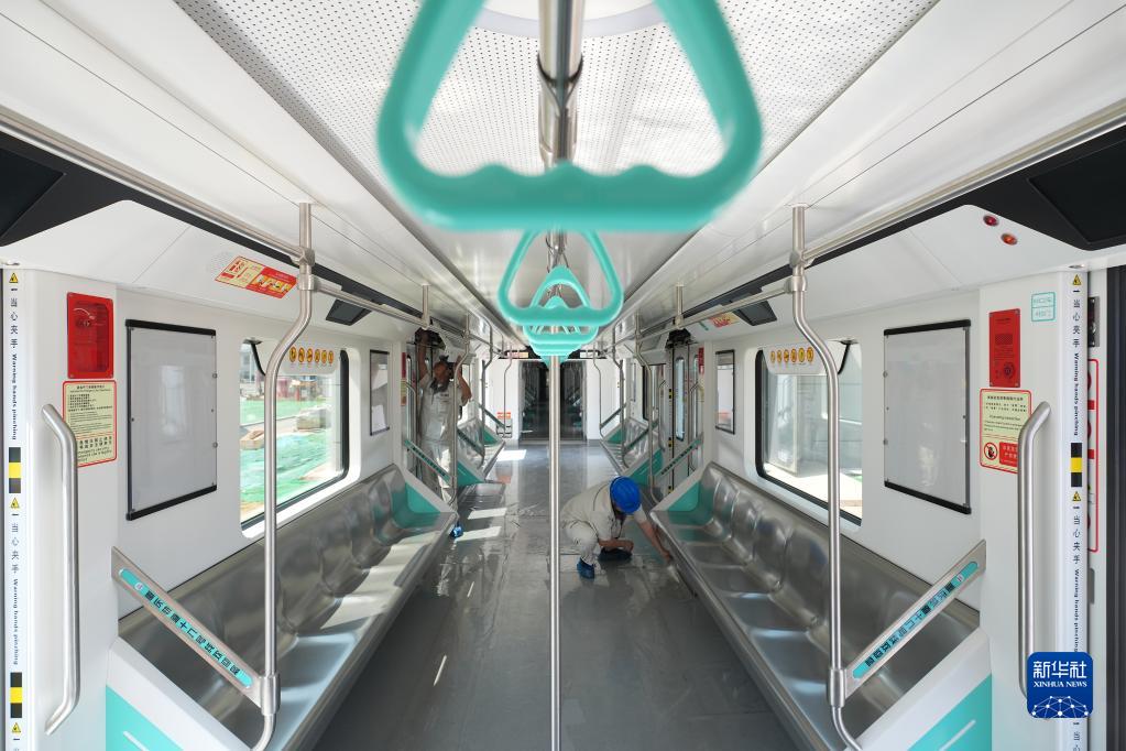 4月19日,在重慶市軌道交通18號線(xiàn)金鰲寺車(chē)輛段,工作人員在對裝配下線(xiàn)的電客車(chē)進(jìn)行檢查。