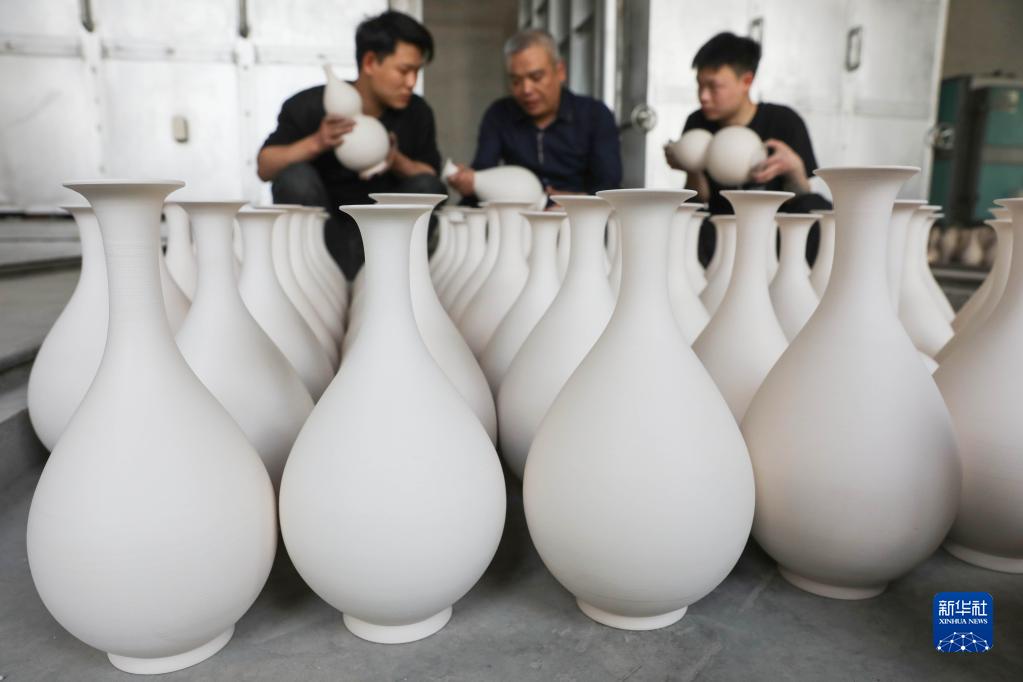 4月19日,在寶豐縣一家汝瓷企業(yè),汝瓷藝人王占穩(中)與同事一起挑選汝瓷素坯。