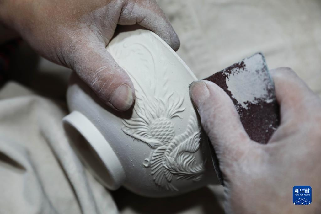 4月19日,在寶豐縣一家汝瓷企業(yè)生產(chǎn)車(chē)間,汝瓷藝人在打磨素坯。