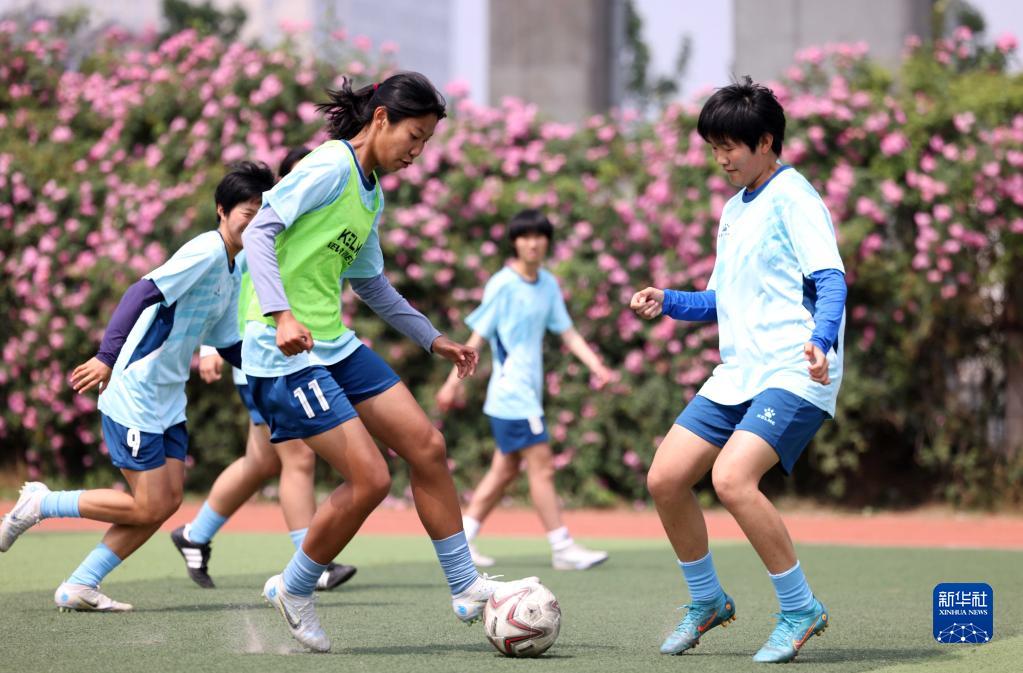 4月19日,在安徽省合肥市裕溪路學(xué)校,女足隊員進(jìn)行足球訓練。