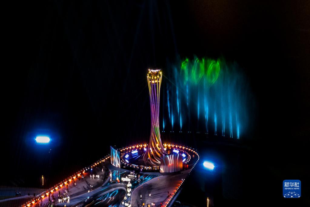 這是4月19日拍攝的第31屆世界大學(xué)生夏季運動(dòng)會(huì )主火炬以及映在水幕上的“100”字樣(無(wú)人機照片)。