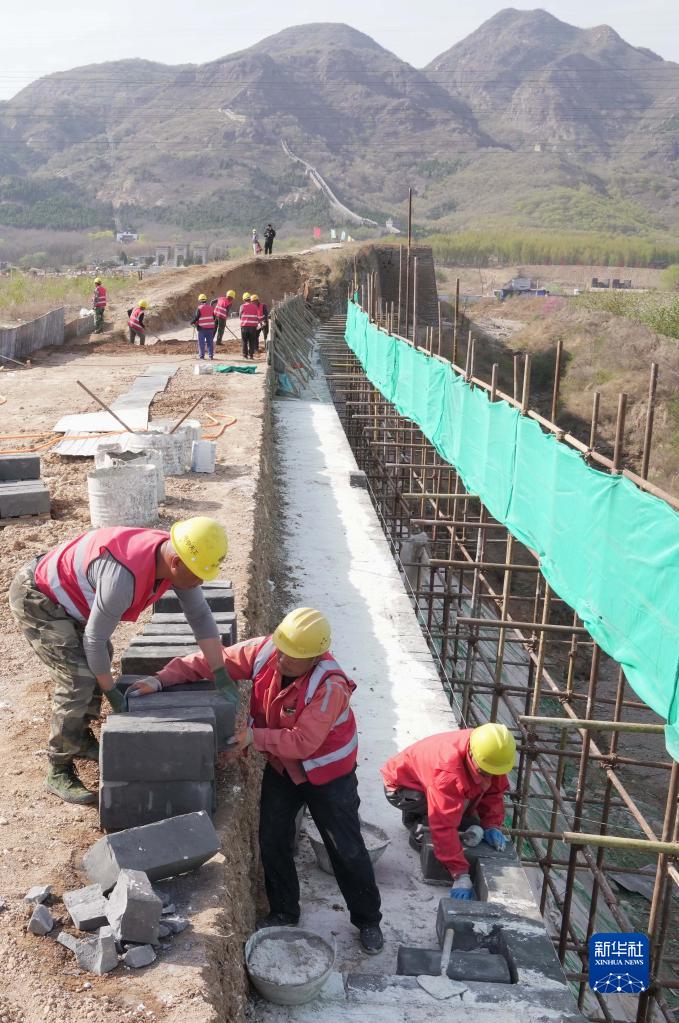 4月19日,工人在山海關(guān)長(cháng)城北翼城修繕工程工地施工。