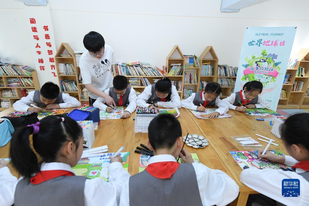 4月20日,湖州新風(fēng)實(shí)驗小學(xué)下塘校區的學(xué)生在創(chuàng )作環(huán)保主題的畫(huà)作。