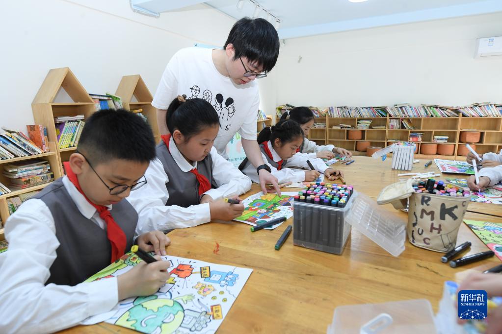 4月20日,湖州新風(fēng)實(shí)驗小學(xué)下塘校區的學(xué)生在老師指導下創(chuàng )作環(huán)保主題的畫(huà)作。