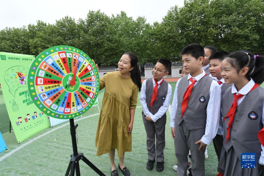 4月20日,湖州新風(fēng)實(shí)驗小學(xué)下塘校區的學(xué)生在老師帶領(lǐng)下做垃圾分類(lèi)趣味游戲。