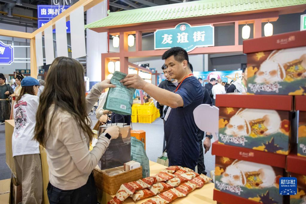 4月20日,參觀(guān)者在茶顏悅色展區購買(mǎi)商品。