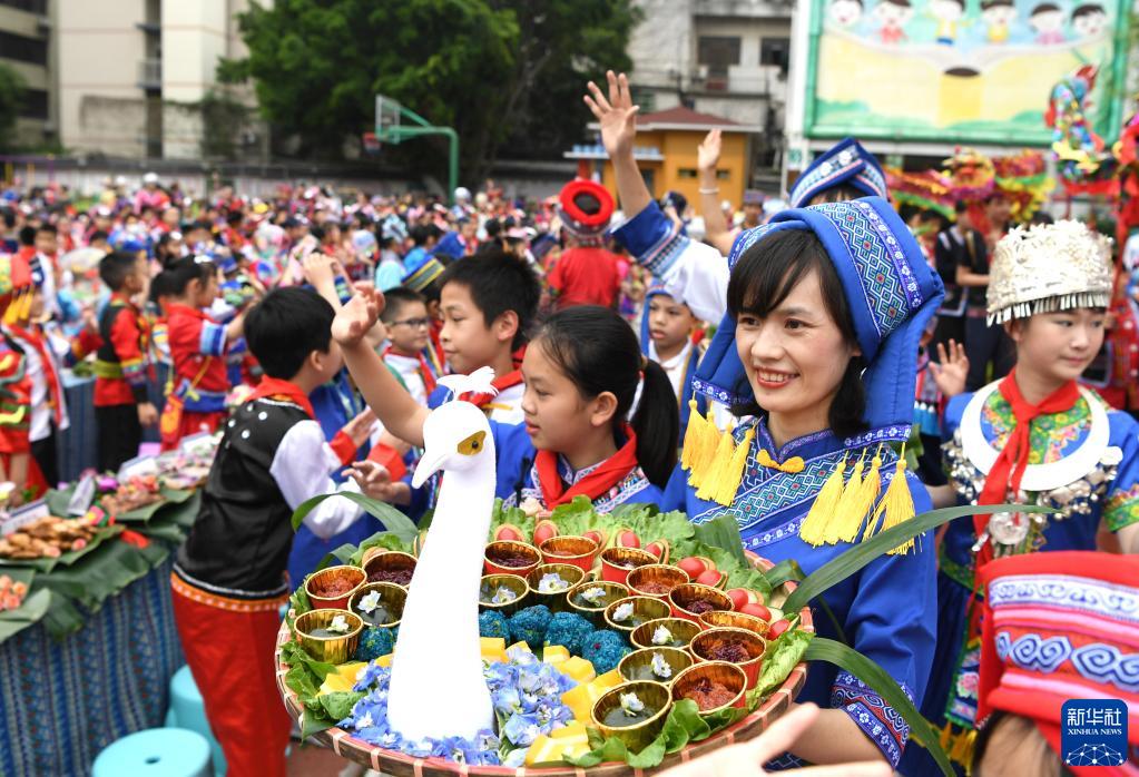 當日,廣西南寧市逸夫小學(xué)舉行2023“壯族三月三”暨“鑄牢中華民族共同體意識”主題教育活動(dòng)。色彩繽紛的民族服裝,民族風(fēng)情濃郁的歌舞表演,多種多樣的特色美食,讓校園處處洋溢著(zhù)歡樂(lè )。隨著(zhù)傳統節日“壯族三月三”臨近,廣西各地陸續開(kāi)展豐富多彩的慶?;顒?dòng)。