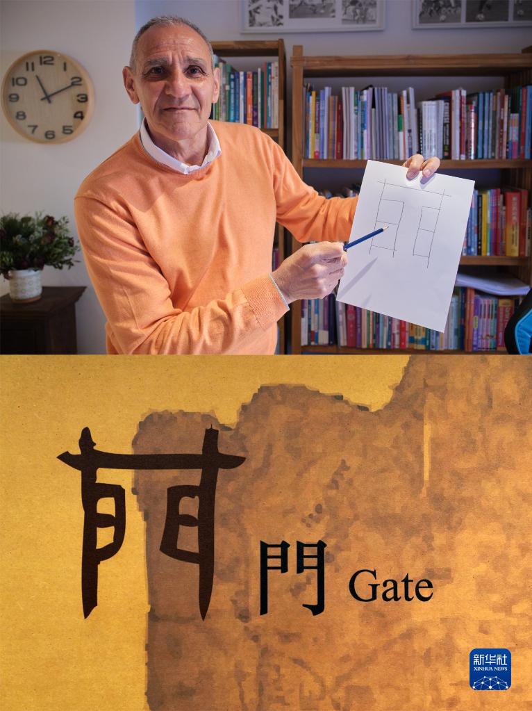 拼版照片:上圖為2023年4月17日,阿方索·弗萊勒在西班牙馬德里的家中展示剛剛學(xué)習的甲骨文“門(mén)”字(新華社記者 孟鼎博 攝);下圖為2023年4月19日在位于中國河南省安陽(yáng)市的中國文字博物館拍攝的“門(mén)”字甲骨文(左)(新華社記者 李安 攝)。