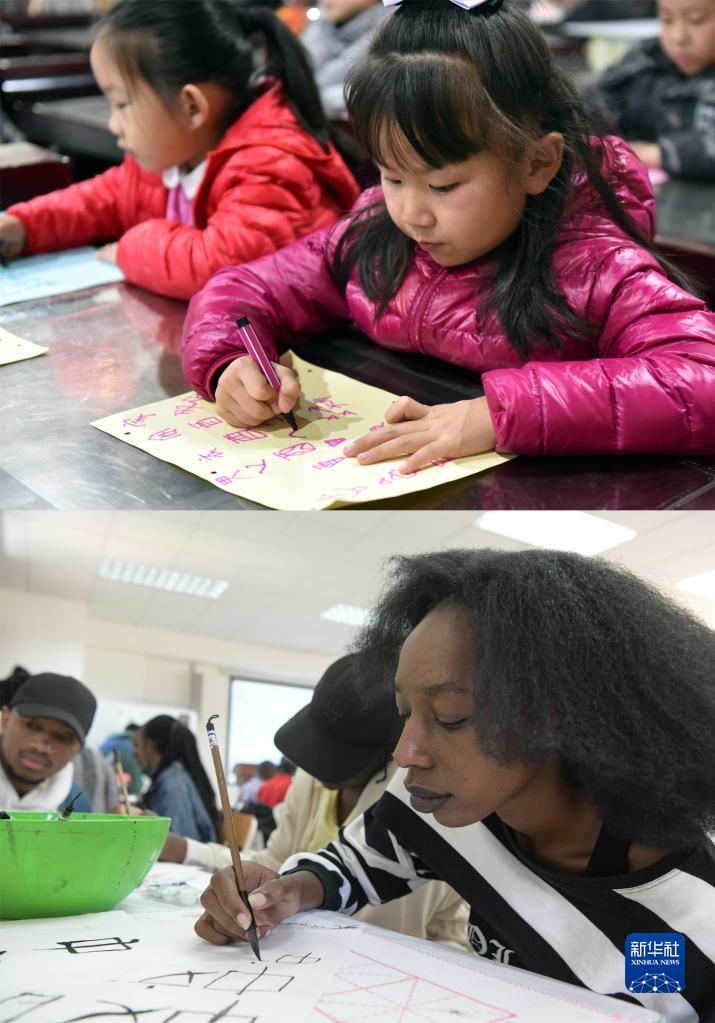 拼版照片:上圖為2017年11月25日,小朋友在中國河南安陽(yáng)的中國文字博物館“甲骨學(xué)堂”上體驗甲骨文的書(shū)寫(xiě)(新華社發(fā) 李嘉南 攝);下圖為2023年4月18日,學(xué)生在肯尼亞內羅畢大學(xué)孔子學(xué)院舉辦的中文日活動(dòng)上寫(xiě)毛筆字(新華社記者 韓旭 攝)。