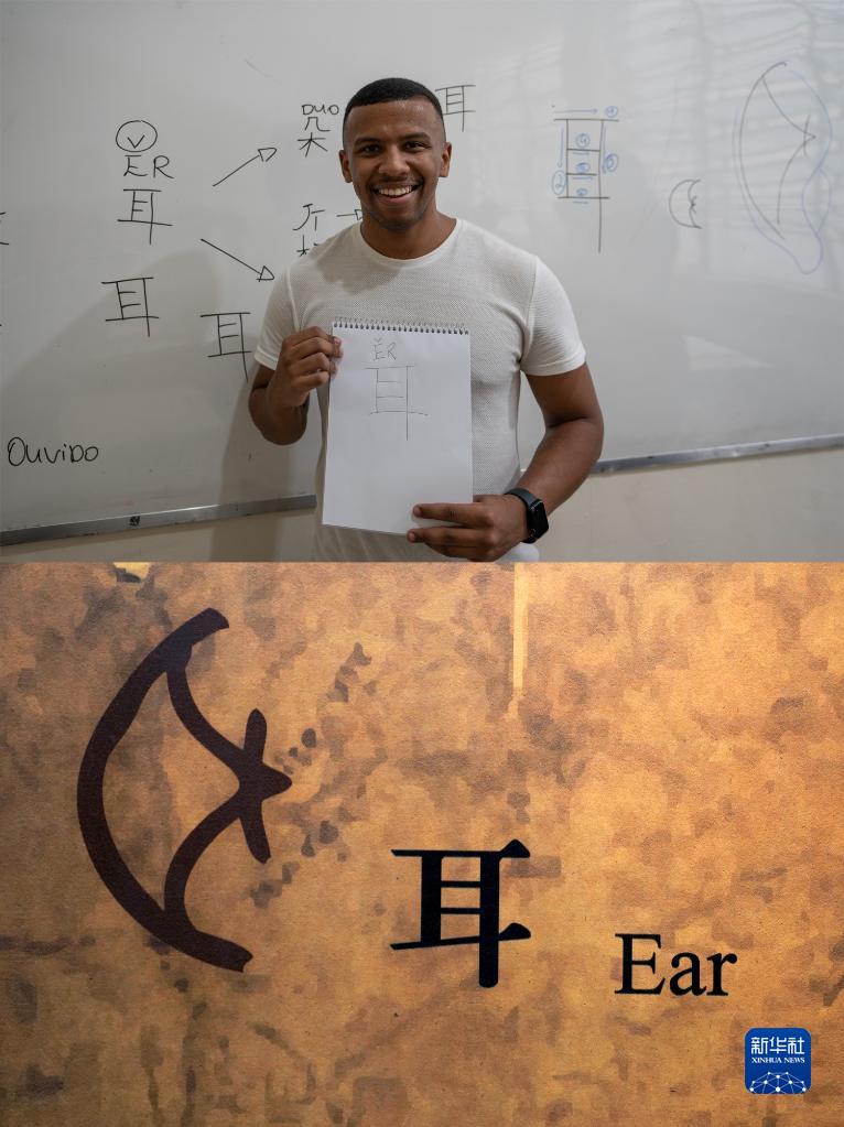 拼版照片:上圖為2023年4月18日,在巴西里約熱內盧,中文教師吉列爾梅在中文課堂后展示“耳”字(新華社記者 王天聰 攝);下圖為2023年4月19日在位于中國河南省安陽(yáng)市的中國文字博物館拍攝的“耳”字甲骨文(左)(新華社記者 李安 攝)。
