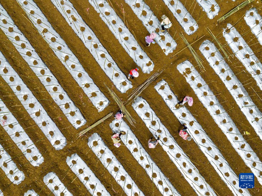 4月20日,農民在貴州省安順市西秀區舊州鎮浪塘村田間搭建冬瓜架(無(wú)人機照片)。