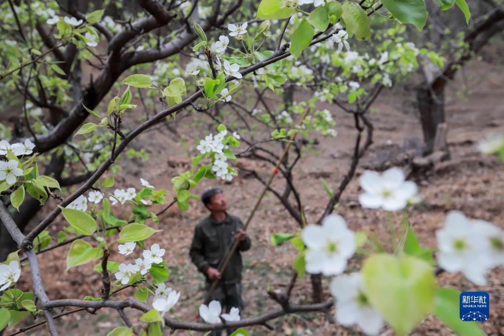 4月20日,河北省遷西縣上營(yíng)鎮農民在果園勞作。