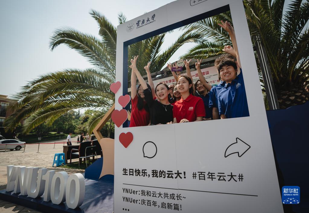 4月20日,云南大學(xué)呈貢校區師生在校慶展板處合影留念。