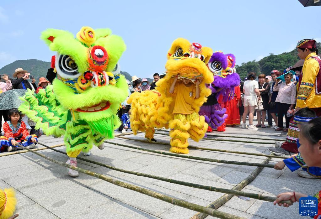 4月20日,在柳城縣鳳山鎮鳳鳴廣場(chǎng),舞獅藝人在跳竹竿舞。