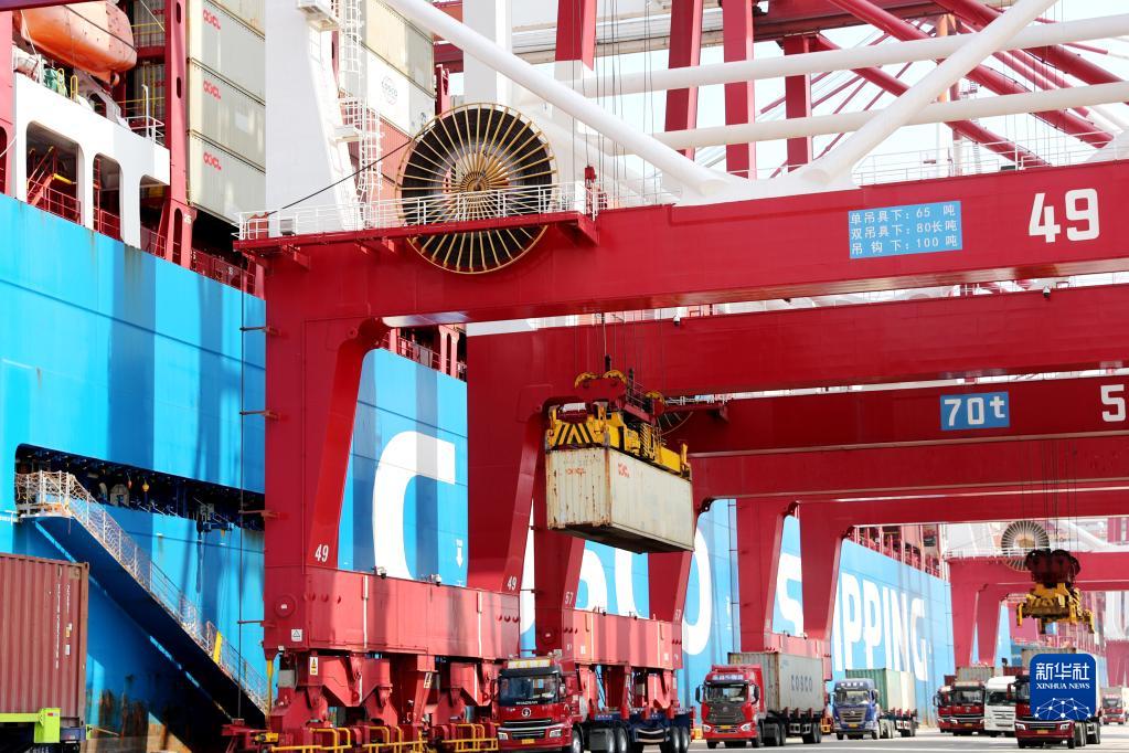 4月20日,在山東港口青島港前灣聯(lián)合集裝箱碼頭,一艘貨輪在裝載貨物。