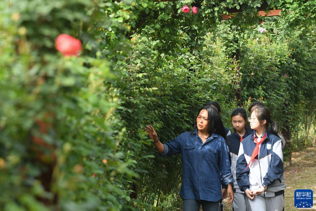 4月20日,玫瑰莊園的創(chuàng )始人季梅(左一)向前來(lái)研學(xué)的中學(xué)生介紹玫瑰品種。