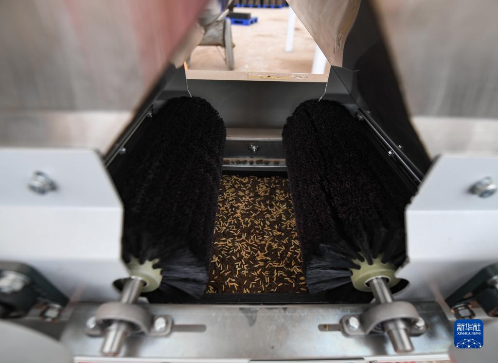 4月20日,在彭山區公義鎮,智能水稻育秧播種流水線(xiàn)將種子播種到育秧盤(pán)內。
