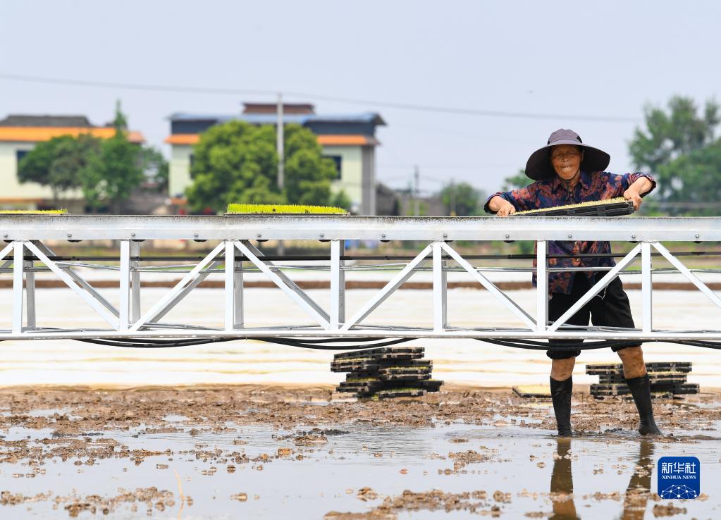 4月20日,在彭山區公義鎮的數智水稻示范基地,工人在秧盤(pán)智能傳輸帶上轉運育秧盤(pán)。