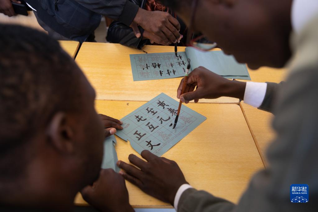 4月20日,在贊比亞首都盧薩卡,學(xué)生在聯(lián)合國中文日活動(dòng)上體驗寫(xiě)毛筆字。