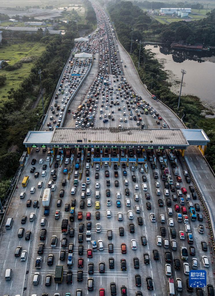 4月19日,印度尼西亞加拉璜一處道路收費站排起長(cháng)龍(無(wú)人機照片)。