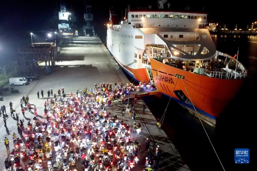 4月19日,騎摩托車(chē)返鄉的民眾在印度尼西亞萬(wàn)丹省芝勒貢登上輪渡(無(wú)人機照片)。