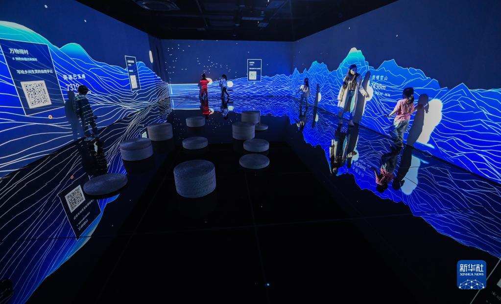 4月21日,讀者在嘉興市圖書(shū)館元宇宙閱讀體驗館的自然課堂通過(guò)環(huán)幕體感投影學(xué)習各大山脈山峰的知識。