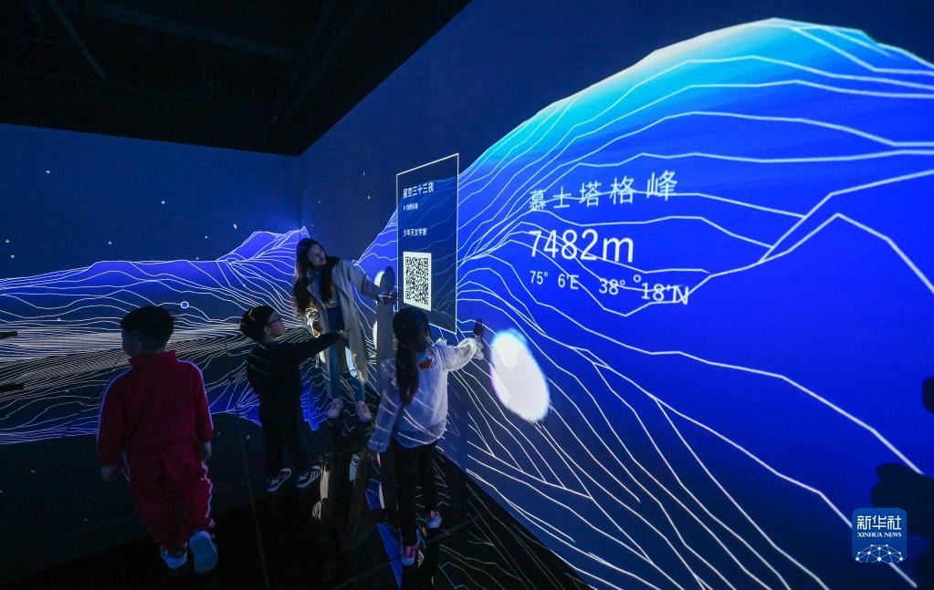 4月21日,讀者在嘉興市圖書(shū)館元宇宙閱讀體驗館的自然課堂通過(guò)環(huán)幕體感投影學(xué)習各大山脈山峰的知識。