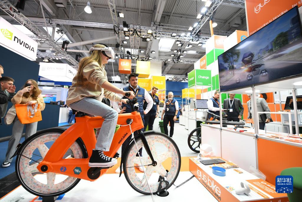 4月20日,在德國漢諾威工博會(huì )上,參觀(guān)者騎在一款由回收塑料制成的自行車(chē)上體驗VR游戲。