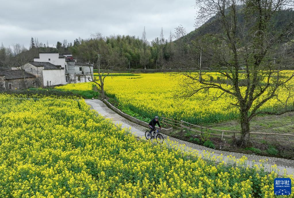 阿明在黟縣油菜花田間的道路上騎行(3月23日攝,無(wú)人機照片)。