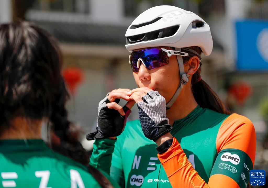 謝敏儀參加女子公路自行車(chē)賽精英組比賽時(shí),在兩賽段間休整(3月26日攝)。