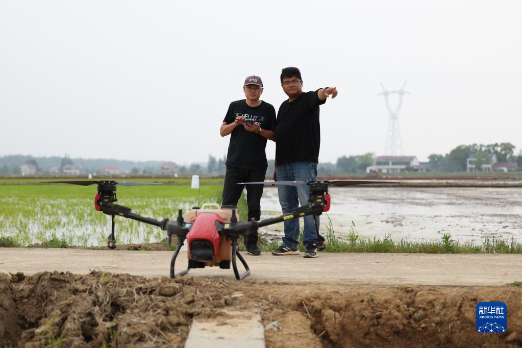 4月21日,在湖南省益陽(yáng)市赫山區中塘村,工作人員通過(guò)手機設定植保無(wú)人機航路。