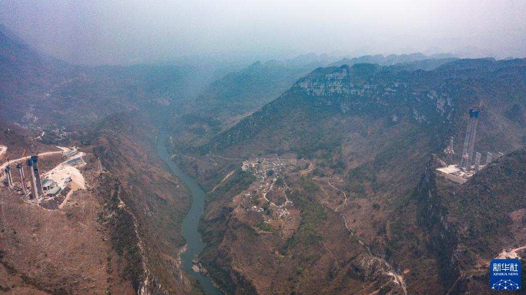4月21日,六安高速花江峽谷大橋6號主塔(圖右)順利實(shí)現封頂(無(wú)人機照片)。