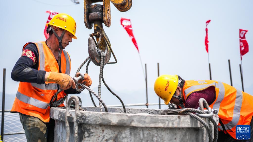 4月21日,工人在花江峽谷大橋6號主塔上進(jìn)行施工。