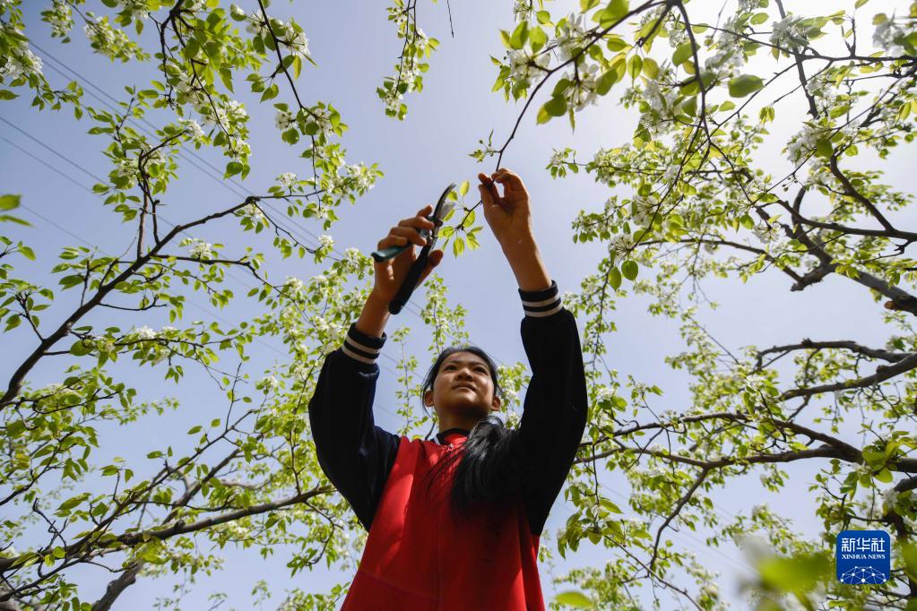 4月21日,承德縣新杖子小學(xué)學(xué)生在學(xué)習為梨樹(shù)梳花。