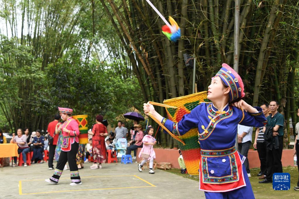 4月21日,在羅城縣米椎林景區,人們參加拋接繡球比賽。