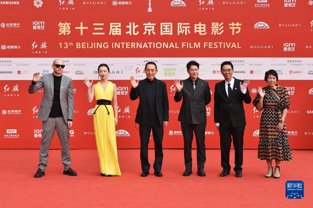 4月21日,本屆北京國際電影節“天壇獎”國際評委會(huì )成員張藝謀(左三)、關(guān)錦鵬(右二)、納達夫·拉皮德(左一)、萍帕卡·托維拉(右一)、張頌文(右三)和周冬雨亮相紅毯儀式。新華社記者 陳鐘昊 攝
