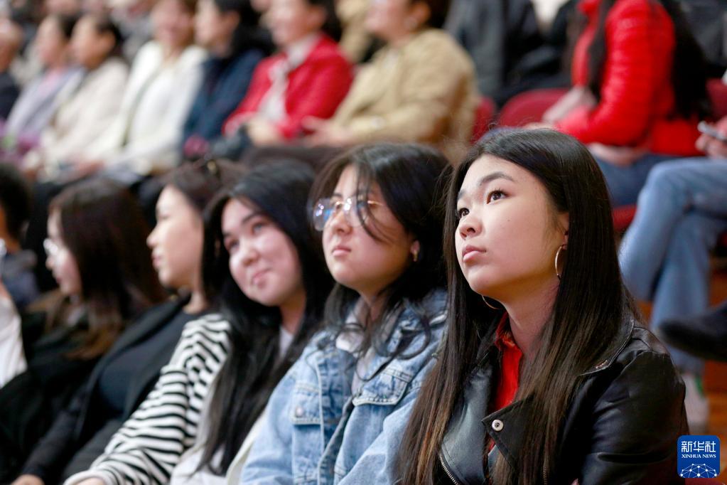 4月20日,青少年學(xué)生在吉爾吉斯斯坦首都比什凱克國立大學(xué)禮堂舉行的天宮對話(huà)——神舟十五號航天員乘組與上海合作組織國家青少年問(wèn)答活動(dòng)上聆聽(tīng)航天員講話(huà)。
