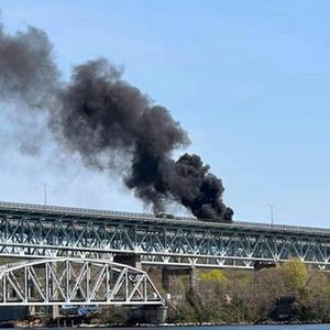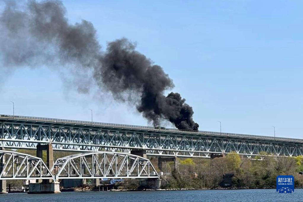 4月21日,美國康涅狄格州的公路橋起火現場(chǎng)濃煙滾滾。